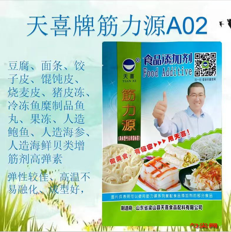 ★功能作用:[筋力源A02型]用于豆腐类、生湿面制品品(如面条、饺子皮、馄饨皮、烧麦皮) 、生干面制品、方便米面制品、熟肉制品(包括猪皮冻等)、冷冻鱼糜制品(包括鱼丸等)、果冻、其他(仅 限 人造海鲜产品,如人造鲍鱼、人造海参、人造海鲜贝类等)、其他固体饮料等增稠,抗融化、耐煮。[筋力源A02型]很好的特性就是弹性较佳、高温不易融化、成型好,非常适合制作高品质食品。[筋力源A02型]还可用于猪皮冻、烤肠、蒸水晶猪皮冻等。