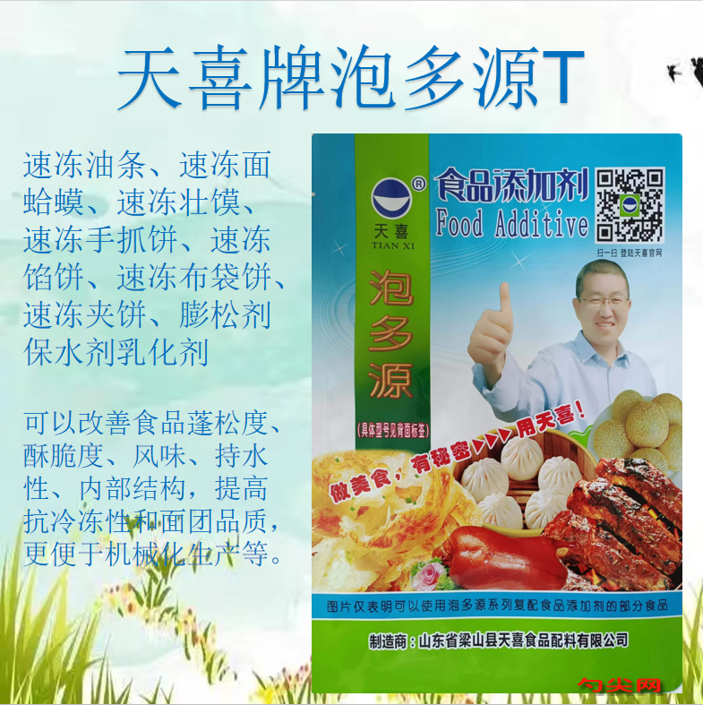 ★商品名:天喜牌泡多源T型 产品名称:泡多源牌复配凝固膨松剂4型号:PDY-T本品按照《食品安全国家标准 食品添加剂使用标准GB2760》及补充规定的品种、应用分类、使用范围、最大使用量、残留量等科学组方,并且按照《食品安全国家标准 复配食品添加剂通则GB26687》精心配制而成。本品已经通过食品生产许可,保障食品安全。用户按照本说明的用法用量生产制作的发酵面制品(食品分类号:06.03.02.03)、油炸面制品(食品分类号:06.03.02.05) 、食用淀粉(食品分类号:06.05.01)、方便米面制品(食品分类号:06.07)、冷冻米面制品(食品分类号:06.08)、焙烤食品(食品分类号:07.0)、预制肉制品(食品分类号:08.02)、熟制肉制品(食品分类号:08.03)、冷冻水产品(食品分类号:09.02.01)、冷冻鱼糜制品(食品分类号:09.02.03)既不会超标也不会超量。