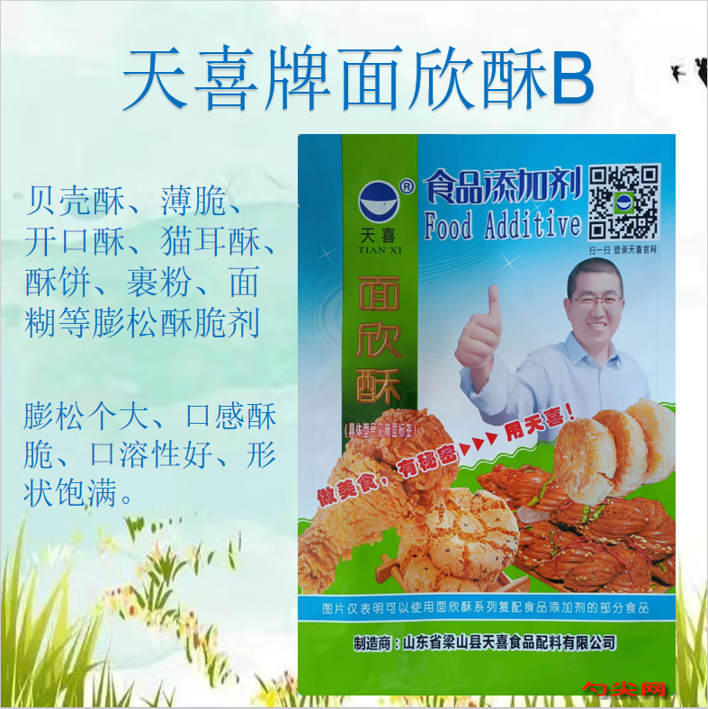 ★商品名:天喜牌面欣酥B型 产品名称:面欣酥牌复配稳定膨松剂5 型号:MXS-B 本品完全按照《食品安全国家标准 食品添加剂使用标准GB2760》及补充规定的品种、应用分类、使用范围、最大使用量、残留量等科学组方,并且按照《食品安全国家标准 复配食品添加剂通则GB26687》精心配制而成。本品已经通过食品生产许可,保障食品安全。用户按照本说明的用法用量生产制作的裹粉、面糊、煎炸粉(食品分类号:06.03.02.04)、油炸面制品(食品分类号:06.03.02.05)、焙烤食品(食品分类号:07.0)既不会超标也不会超量。