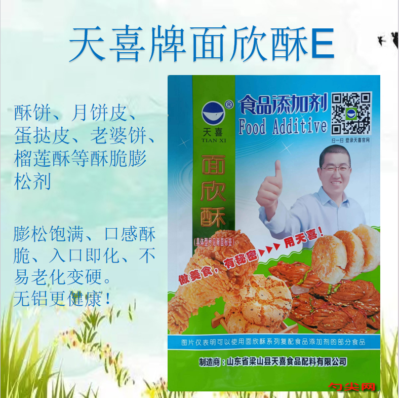 ★商品名:天喜牌面欣酥E型 产品名称:面欣酥牌复配乳化膨松剂2 型号:MXS-E 本品完全按照《食品安全国家标准 食品添加剂使用标准GB2760》及补充规定的品种、应用分类、使用范围、最大使用量、残留量等科学组方,并且按照《食品安全国家标准 复配食品添加剂通则GB26687》精心配制而成。本品已经通过食品生产许可,保障食品安全。用户按照本说明的用法用量生产制作的发酵面制品(食品分类号:06.03.02.03)、裹粉、面糊、煎炸粉(食品分类号:06.03.02.04)、油炸面制品(食品分类号:06.03.02.05)、焙烤食品(食品分类号:07.0)既不会超标也不会超量。