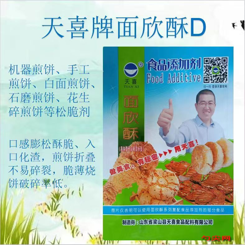 ★商品名:天喜牌面欣酥D型 产品名称:面欣酥牌复配增稠膨松剂4 型号:MXS-D本品完全按照《食品安全国家标准 食品添加剂使用标准GB2760》及补充规定的品种、应用分类、使用范围、最大使用量、残留量等科学组方,并且按照《食品安全国家标准 复配食品添加剂通则GB26687》精心配制而成。本品已经通过食品生产许可,保障食品安全。用户按照本说明的用法用量生产制作的裹粉、面糊、煎炸粉(食品分类号:06.03.02.04)、油炸面制品(食品分类号:06.03.02.05)、焙烤食品(食品分类号:07.0)既不会超标也不会超量。★配料表:碳酸氢铵、焦磷酸二氢二钠、硫酸铝钾、碳酸氢钠、黄原胶、木瓜蛋白酶、食用玉米淀粉。