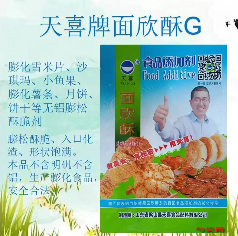 ★功能作用:采用〔面欣酥G型〕加工制作的膨化雪米片、沙琪玛、小鱼果、膨化薯条、提糖月饼(京式、广式、潮式、港式)、酥皮月饼(苏式)、钙奶饼干、酥性饼干、大米小小酥(膨化食品)等膨化食品、发酵面制品、裹粉、油炸面制品、焙烤食品膨松酥脆、入口化渣、形状饱满。〔面欣酥G型〕不含明矾不含铝,生产膨化食品,安全合法。〔面欣酥G型〕还可用于白面江米条、木糖醇沙琪玛、黑芝麻酥月饼、木糖醇月饼、广式月饼等。