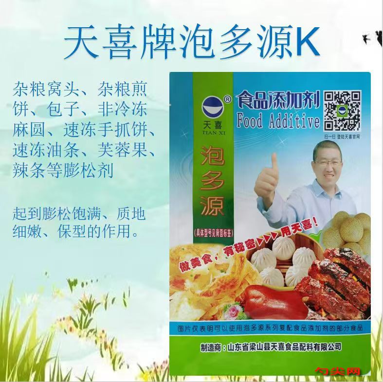 ★功能作用:采用本品加工制作的杂粮窝头、杂粮煎饼、炸猪皮、炸凤爪、馒头、包子、非冷冻包馅芝麻球、非冷冻麻圆、麻球、速冻汤圆、冷冻鱼糕、肉丸、蒸面筋、速冻包子、速冻手抓饼、速冻油条、速冻油馍头、速冻披萨饼、芙蓉果、大京果、辣条、烤冷面等各类食品,包括杂粮制品、发酵面制品、油炸面制品、冷冻米面制品、方便米面制品、肉制品、水产品等。起到膨松饱满、质地细嫩、保型的作用。速冻麻圆建议使用泡多源M型和泡多源Q型配合使用。非冷冻手抓饼建议使用泡多源B型。 〔泡多源K型〕还可用于炸饹馇、速冻手抓饼、糯米面油炸糕、大黄米油炸糕、玉米面棒棒馍、南瓜发糕、果蔬麻球、杂粮馒头、糯米炸糕、麻薯、杂粮煎饼、速冻烧饼、速冻杂粮包、速冻香芋地瓜丸、江米条、玉米粗粮饼、地瓜丸子、黄金玉米贴饼子、杂粮菜团子、泡泡炸糕、铜锣烧、五谷杂粮饼、玉米面棒棒馍、玉米面杂粮烧饼、紫薯豆渣小酥饼、驴打滚、香酥豆腐渣球、豆腐渣窝头、芝麻椒盐豆渣饼、葱花豆渣饼、豆渣杂粮窝头、豆腐渣丸子、豆渣杂粮煎饼、绿豆丸子、玉米杂粮锅贴、粗粮香酥饼、江米条、南瓜糯米饼、红薯丸子、油炸猪皮、玉米面煎饼、菜团子、松软玉米饼、夹馅大麻圆芝麻球、玉米豆面窝头、四合面饼子、冷冻油炸糕、速冻肉包、玉米面豆面窝窝头、麻圆、玉米黄金饼、黄金玉米窝头、虎皮凤爪等。