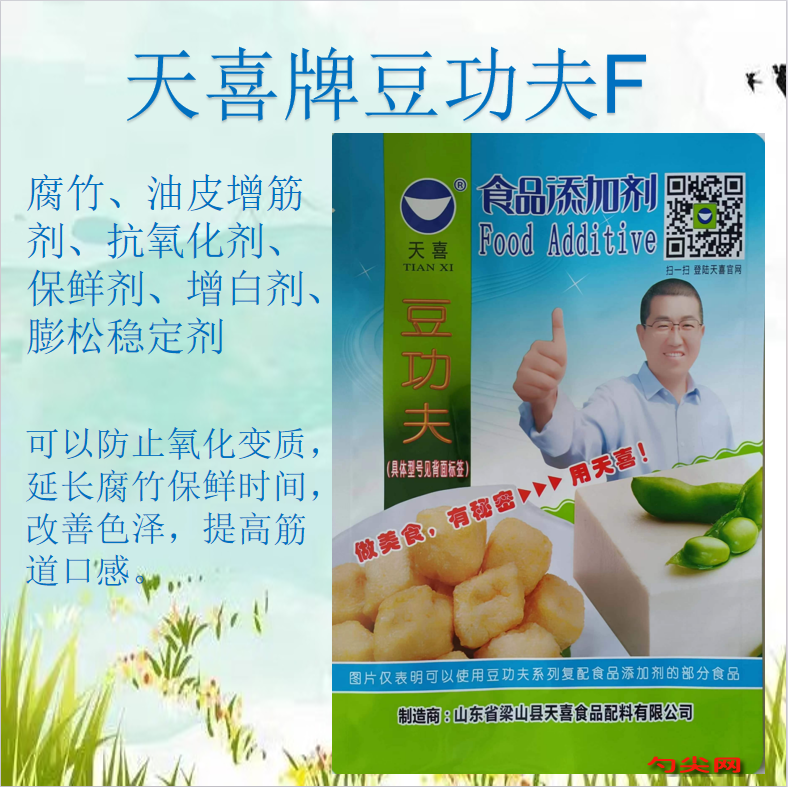 ★商品名:天喜牌豆功夫F型 产品名称:豆功夫牌复配抗氧化膨松剂4 型号:DGF-F 本品按照《食品安全国家标准 食品添加剂使用标准GB2760》及补充规定的品种、应用分类、使用范围、最大使用量、残留量等科学组方,并且按照《食品安全国家标准 复配食品添加剂通则GB26687》精心配制而成。本品已经通过食品生产许可,保障食品安全。用户按照本说明的用法用量生产制作的腐竹类(食品分类号:04.04.01.04)既不会超标也不会超量。