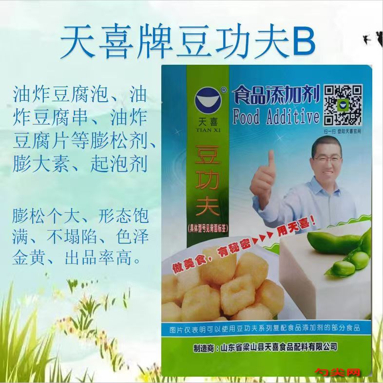 ★商品名:天喜牌豆功夫B型 产品名称:豆功夫牌复配稳定膨松剂7 型号:DGF-B 本品按照《食品安全国家标准 食品添加剂使用标准GB2760》及补充规定的品种、应用分类、使用范围、最大使用量、残留量等科学组方,并且按照《食品安全国家标准 复配食品添加剂通则GB26687》精心配制而成。本品已经通过食品生产许可,保障食品安全。用户按照本说明的用法用量生产制作的豆类制品(食品分类号:04.04)、面糊(如用于鱼和禽肉的拖面糊)、裹粉、煎炸粉(食品分类号:06.03.02.04)、油炸面制品(食品分类号:06.03.02.05)、虾味片(食品分类号:06.05.02.02)、焙烤食品(食品分类号:07.0)既不会超标也不会超量。★配料表:葡萄糖酸-δ-内酯、碳酸氢钠、碳酸氢铵、硫酸铝钾、食用玉米淀粉。