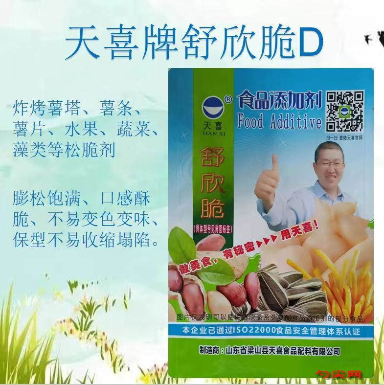 ★商品名:天喜牌舒欣脆D型 产品名称:舒欣脆牌复配抗氧化膨松剂2 型号:SXC-D 本品完全按照《食品安全国家标准 食品添加剂使用标准GB2760》及补充规定的品种、应用分类、使用范围、最大使用量、残留量等科学组方,并且按照《食品安全国家标准 复配食品添加剂通则GB26687》精心配制而成。本品已经通过食品生产许可,保障食品安全。用户按照本说明的用法用量生产制作的 各类食品(配料表中成分在GB2760表A.1中有限量要求的食品 除外;配料表中成分在GB2760表A.3中所例外的食品除外)既不会超标也不会超量。★配料表:碳酸氢钠、葡萄糖酸-δ-内酯、碳酸钠、碳酸钙、D-异抗 坏血酸钠、食用玉米淀粉。