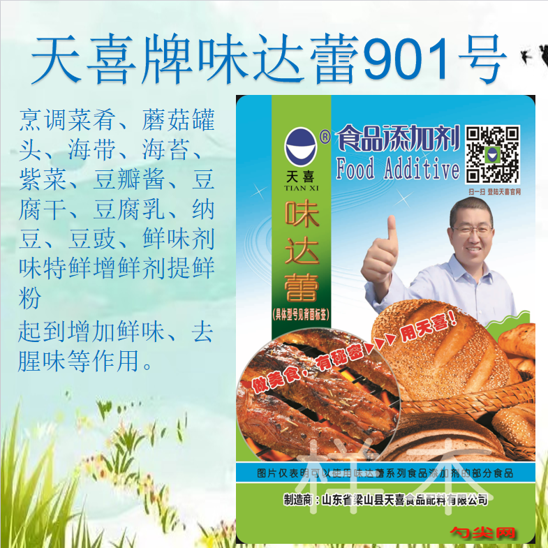 ★商品名:天喜牌味达蕾901号型 产品名称:味达蕾牌复配增味剂2 型号:WDL-901 本品按照《食品安全国家标准 食品添加剂使用标准GB2760》及补充规定的品种、应用分类、使用范围、最大使用量、残留量等科学组方,并且按照《食品安全国家标准 复配食品添加剂通则GB26687》精心配制而成。本品已经通过食品生产许可,保障食品安全。用户按照本说明的用法用量生产制作的各类食品(配料表中成分在GB2760表A.1中有限量要求的食品除外;配料表中成分在GB2760表A.3中所例外的食品除外)既不会超标也不会超量。