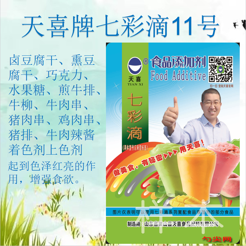 ★商品名:天喜牌七彩滴11号 产品名称:七彩滴牌复配着色剂7 型号:QCD-11 本品按照《食品安全国家标准 食品添加剂使用标准GB2760》及补充规定的品种、应用分类、使用范围、最大使用量、残留量等科学组方,并且按照《食品安全国家标准 复配食品添加剂通则GB26687》精心配制而成。本品已经通过食品生产许可,保障食品安全。用户按照本说明的用法用量生产制作的豆干再制品(食品分类号:04.04.01.03)、可可制品、巧克力和巧克力制品, 包括代可可脂巧克力及制品(食品分类号:05.01)、糖果(食品分类号:05.02)、面糊(如用于鱼和禽肉的拖面糊)、裹粉、煎炸粉(食品分类号:06.03.02.04)、调理肉制品(生肉添加调理料) (食品分类号:08.02.01)、酱及酱制品(食品分类号:12.05)、复合调味料(食品分类号:12.10)既不会超标也不会超量。