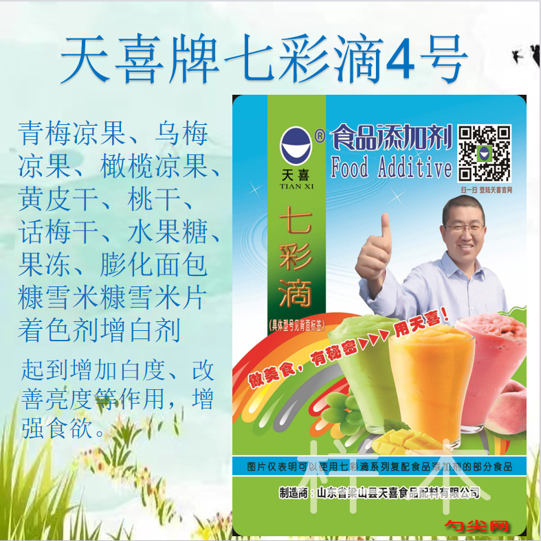 ★商品名:天喜牌七彩滴4型 产品名称:七彩滴牌复配稳定着色剂4 型号:QCD-4 本品按照《食品安全国家标准 食品添加剂使用标准GB2760》及补充规定的品种、应用分类、使用范围、最大使用量、残留量等科学组方,并且按照《食品安全国家标准 复配食品添加剂通则GB26687》精心配制而成。本品已经通过食品生产许可,保障食品安全。用户按照本说明的用法用量生产制作的凉果类(食品分类号:04.01.02.08.02)、话化类(食品分类号:04.01.02.08.04)、熟制坚果与籽类(仅限油炸坚果与籽类)(食品分类号:04.05.02.01)、除胶基糖果以外的其他糖果(食品分类号:05.02.02)、果冻(食品分类号:16.01)、膨化食品(食品分类号:16.06)既不会超标也不会超量。